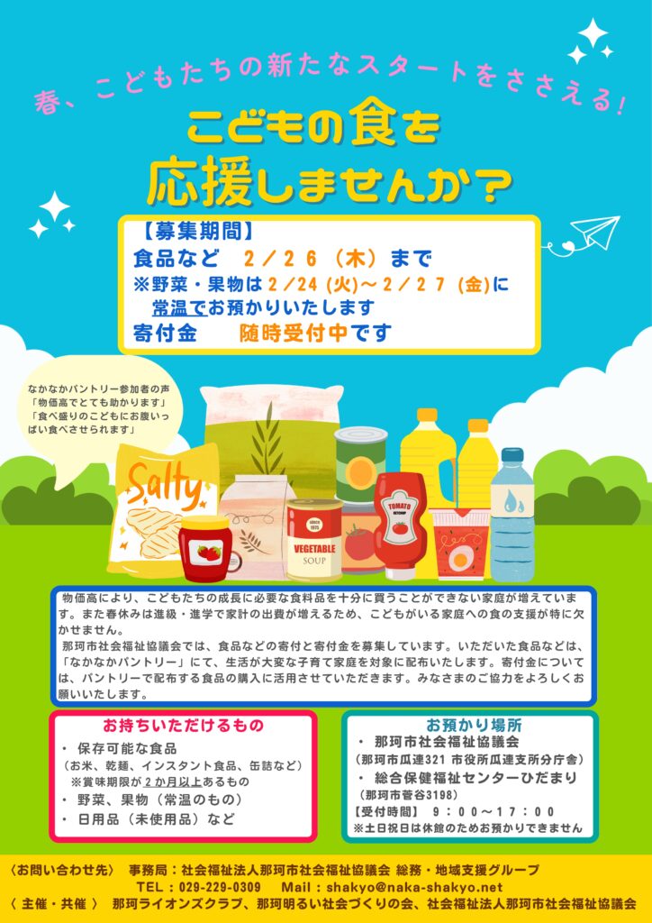 2月なかなかパントリー実施につき食の支援にご協力お願いします!
